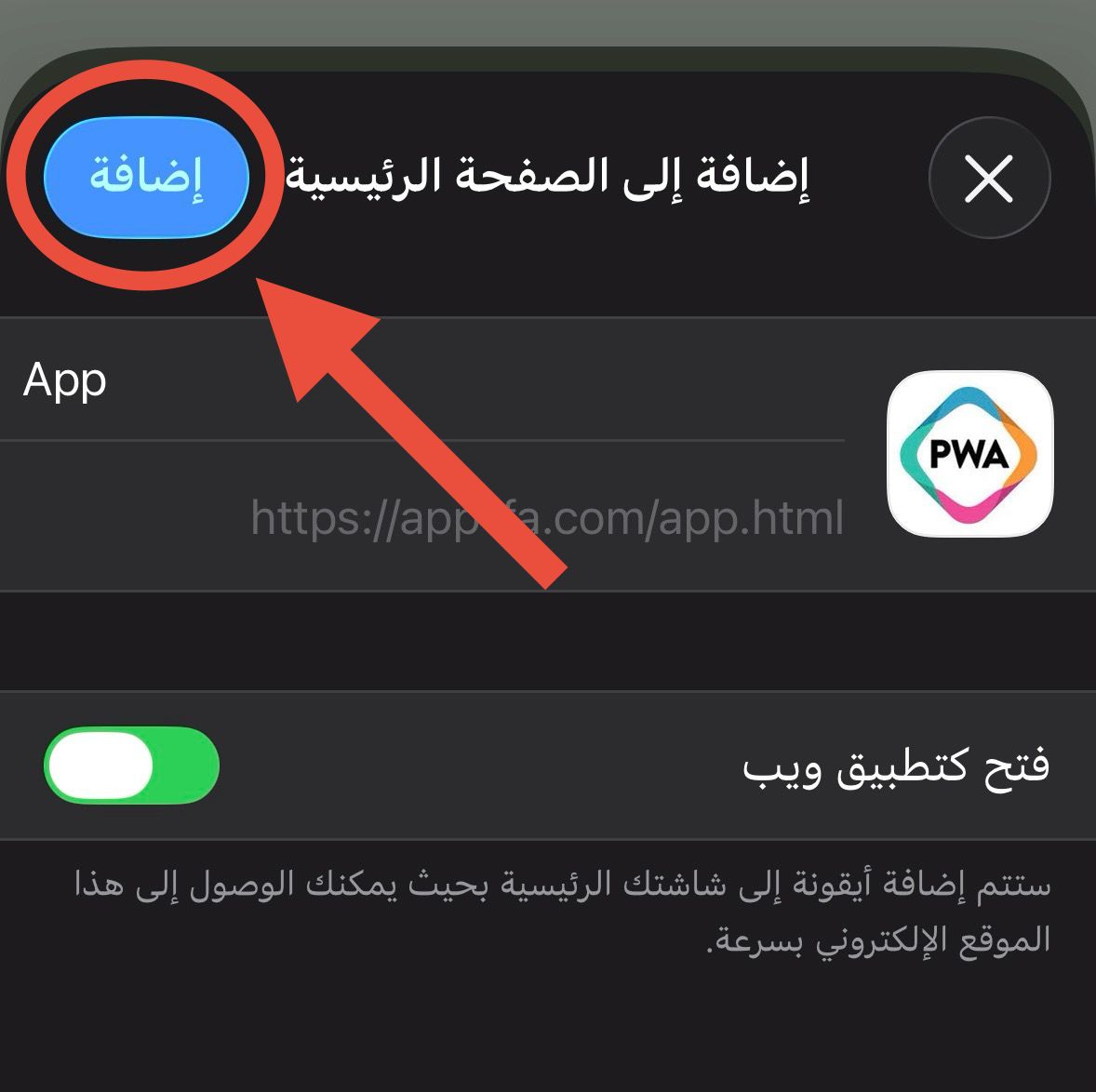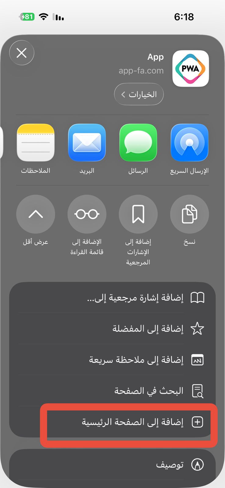 4- اضغط على : إضافة إلى الصفحة الرئيسية